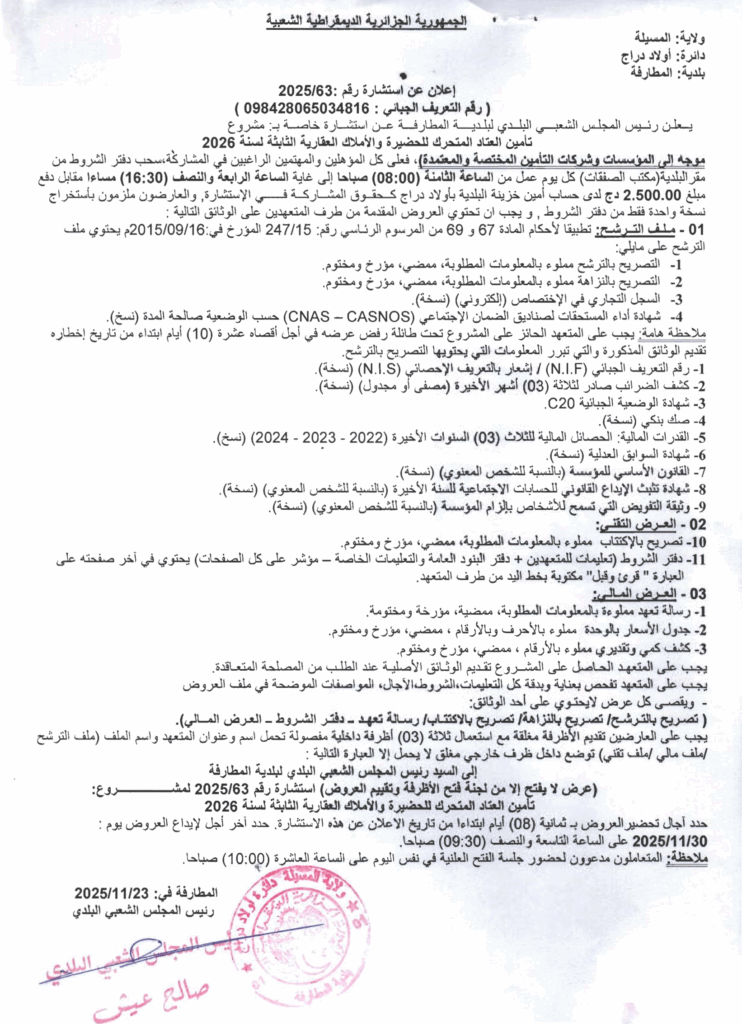 إعلان عن استشارة 2025/63 بلدية المطارفة