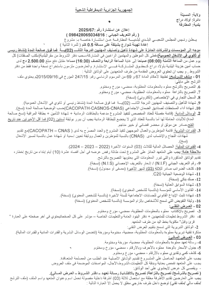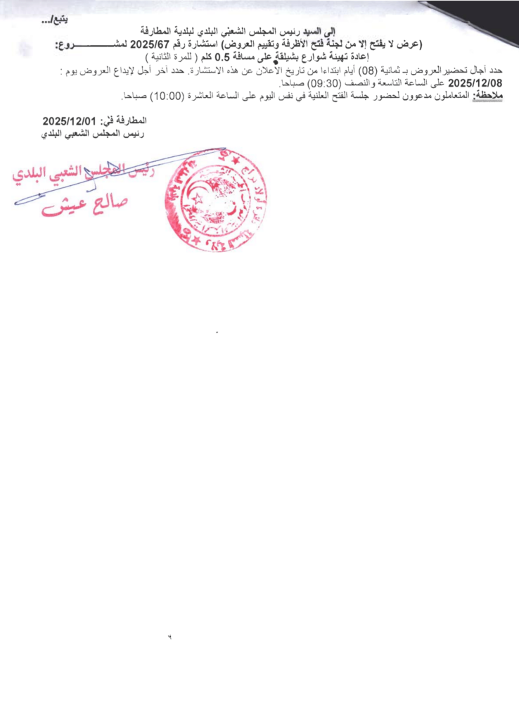 إعلان عن استشارة 2025/67 بلدية المطارفة