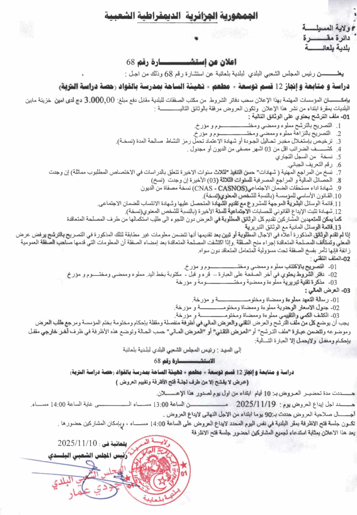 إعلان عن استشارة 2025/68 بلدية بلعايبة