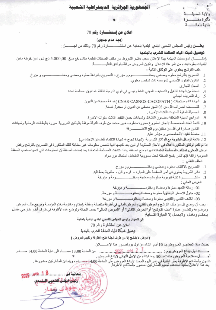 إعلان عن استشارة 2025/70 (بعد عدم جدوى)/ بلدية بلعايبة
