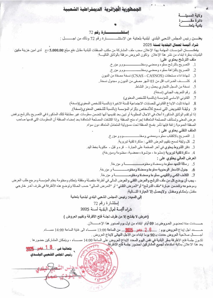 إعلان عن استشارة 2025/72 بلدية بلعايبة
