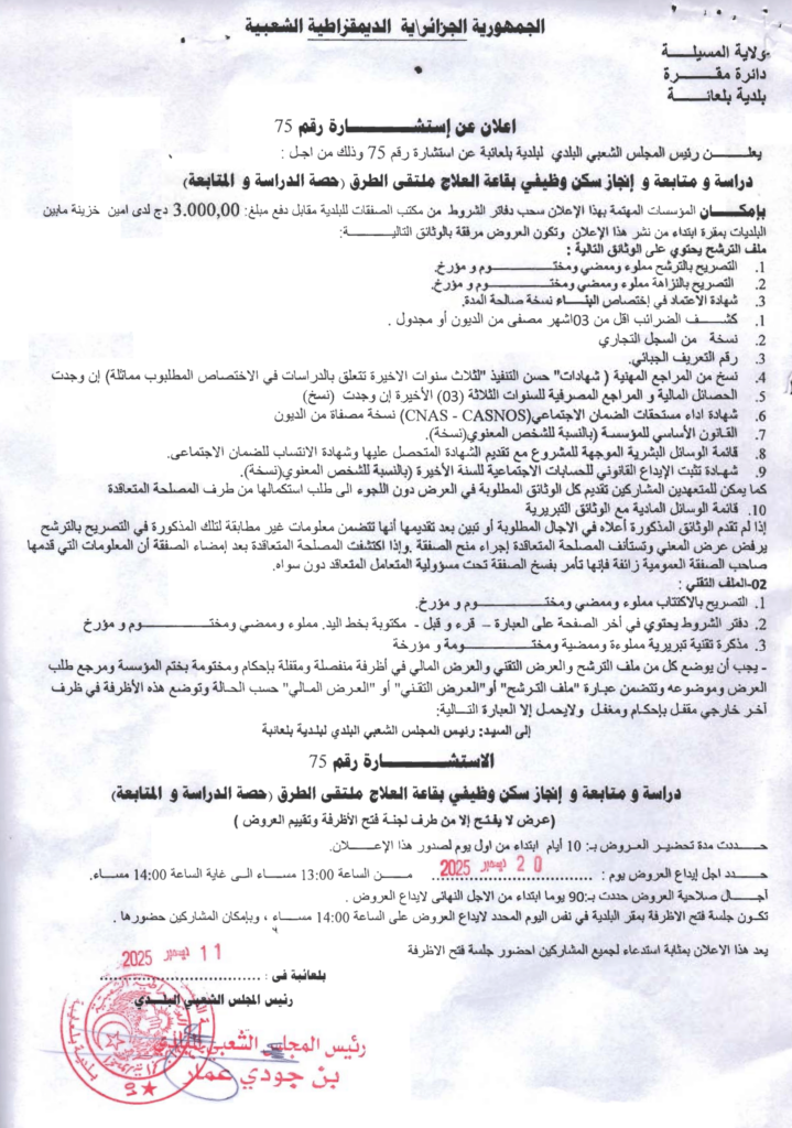 إعلان عن استشارة 2025/75 بلدية بلعايبة