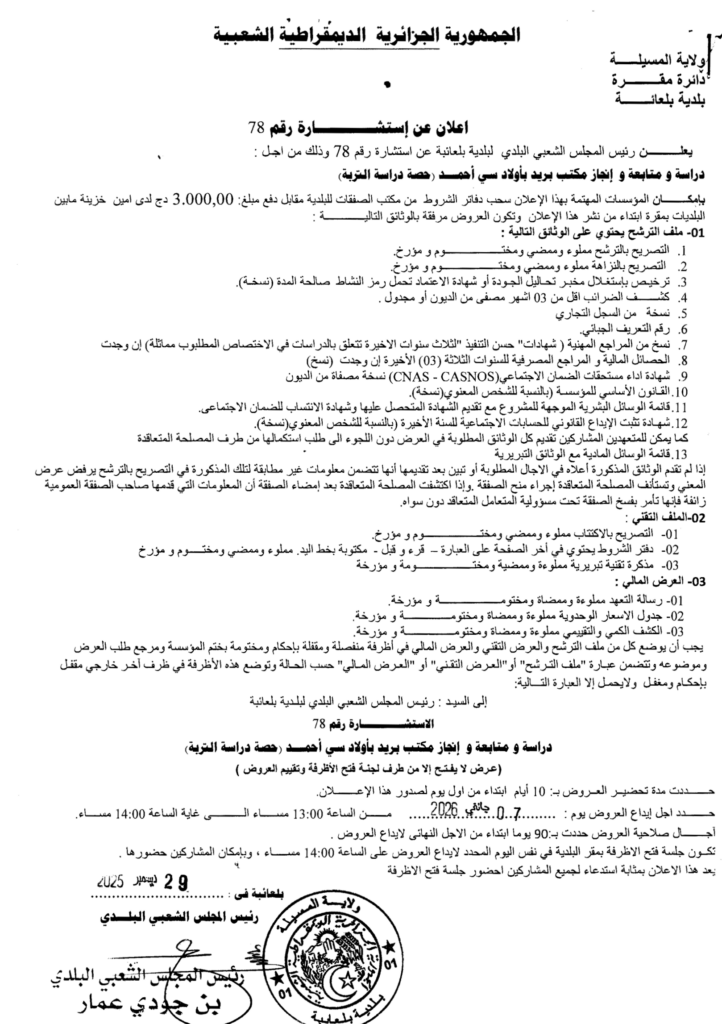 إعلان عن استشارة 2025/78 بلدية بلعايبة