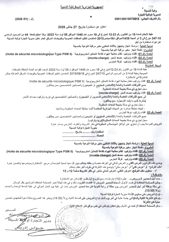 إعلان عن استشارة 2026/01 المديرية الولائية للتجارة لولاية المسيلة