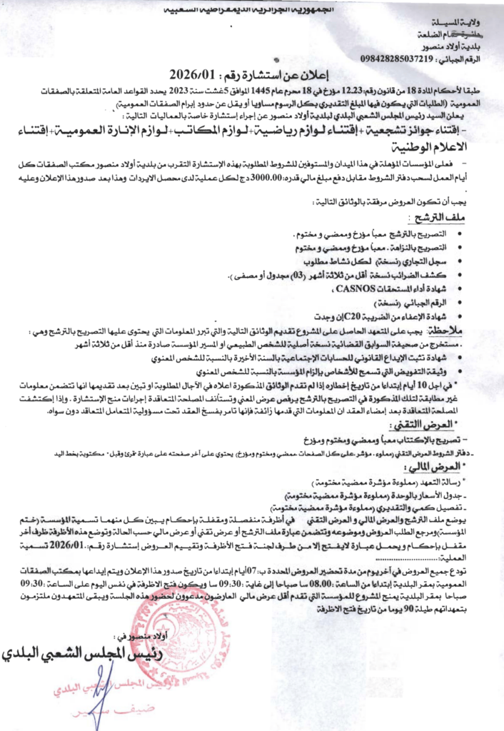 إعلان عن استشارة 2026/01 بلدية أولاد منصور