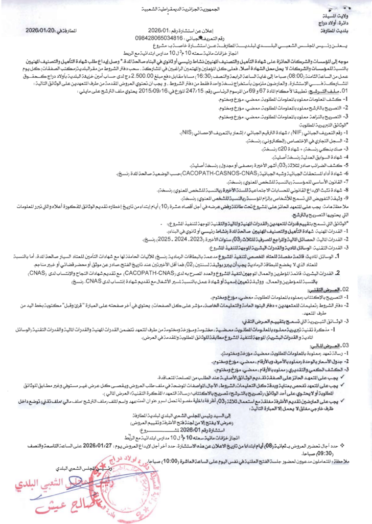 إعلان عن استشارة 2026/01 بلدية المطارفة
