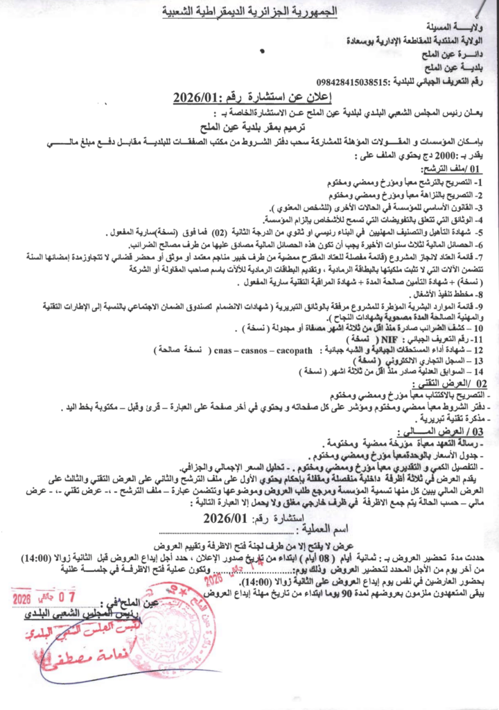 إعلان عن استشارة 2026/01 بلدية عين الملح