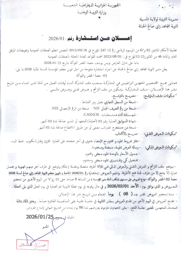 إعلان عن استشارة 2026/01 ثانوية المجاهد زابي صالح الخبانة