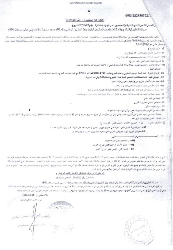 إعلان عن استشارة 2026/02 بلدية أولاد منصور