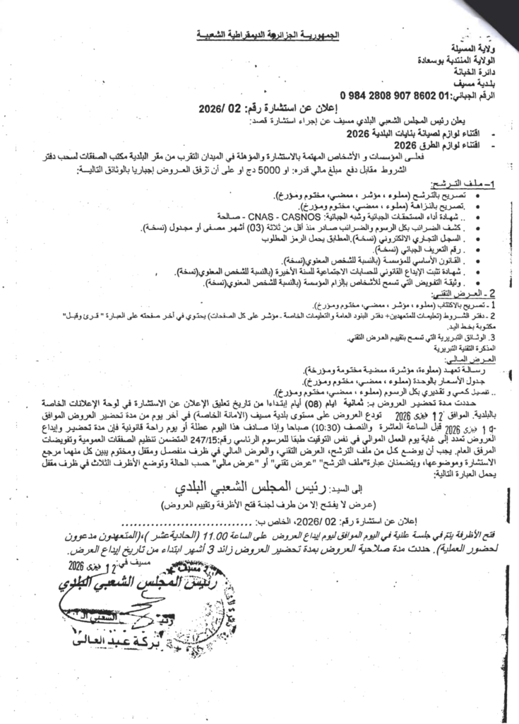إعلان عن استشارة 2026/02 بلدية مسيف