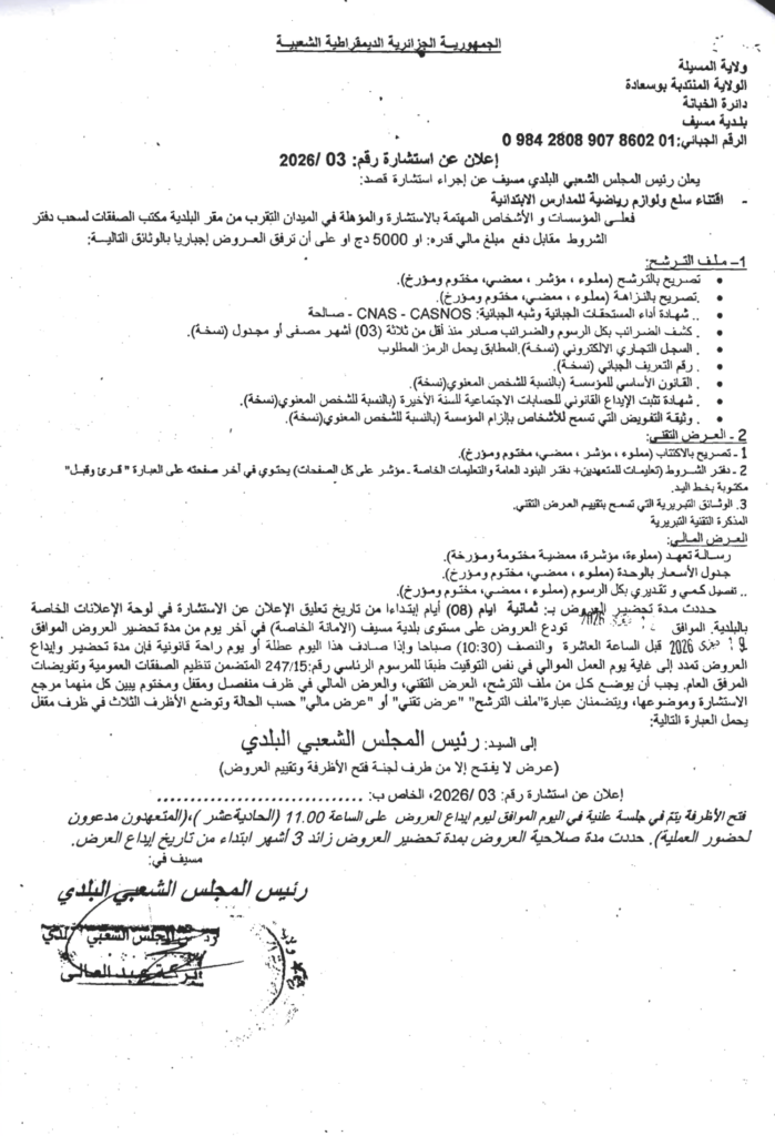 إعلان عن استشارة 2026/03 بلدية مسيف
