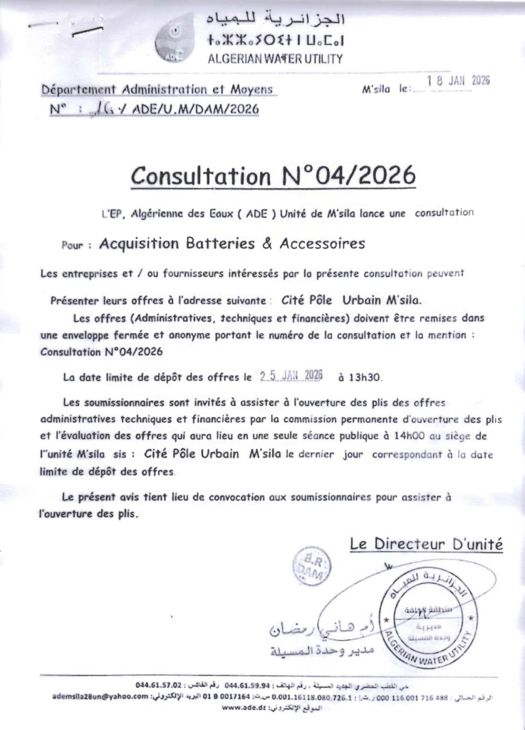 إعلان عن استشارة 2026/04 الجزائرية للمياه