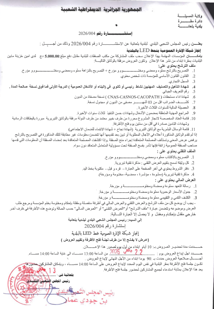 إعلان عن استشارة 2026/04 بلدية بعايبة