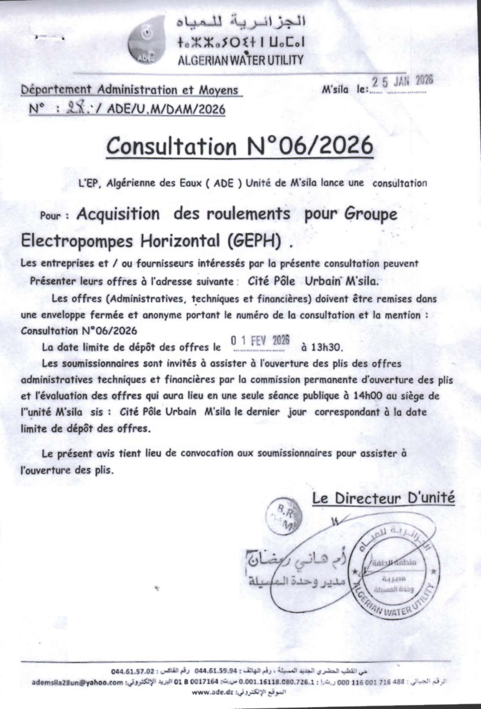 إعلان عن استشارة 2026/06 الجزائرية للمياه وحدة المسيلة