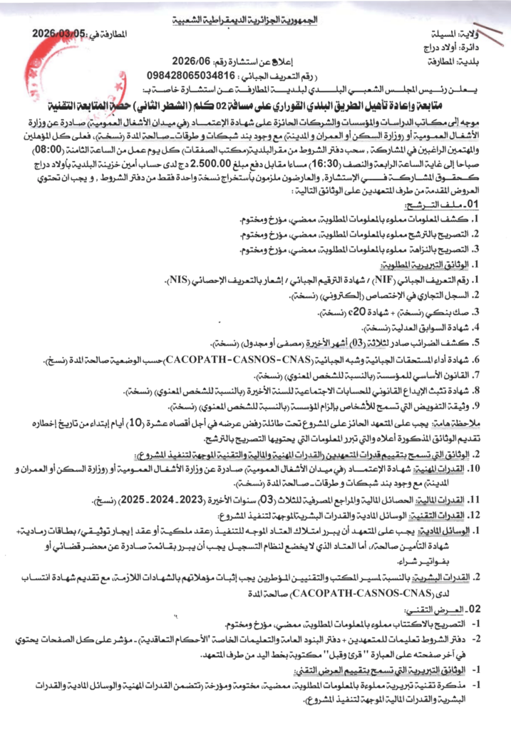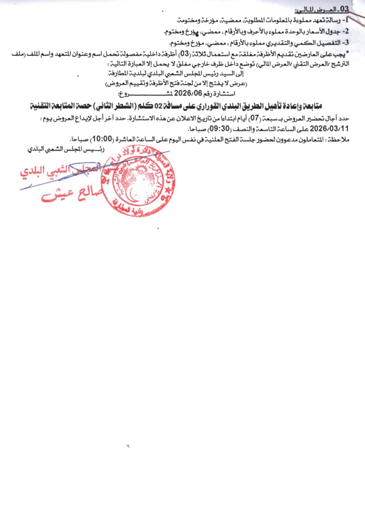 إعلان عن استشارة 2026/06 بلدية المطارفة