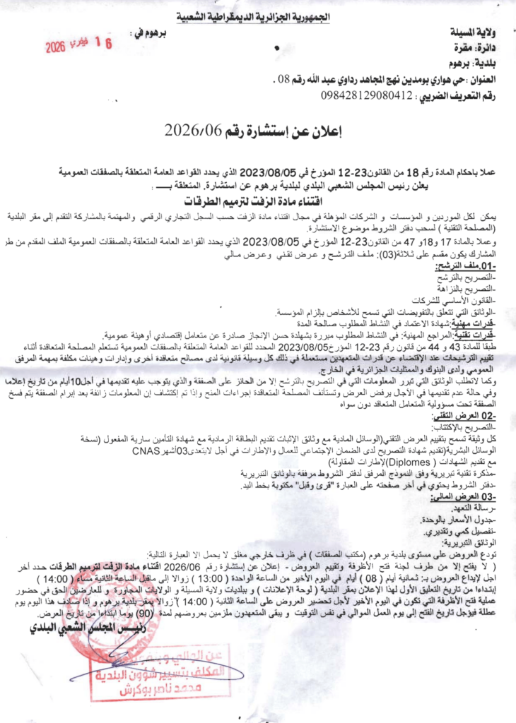 إعلان عن استشارة 2026/06 بلدية برهوم