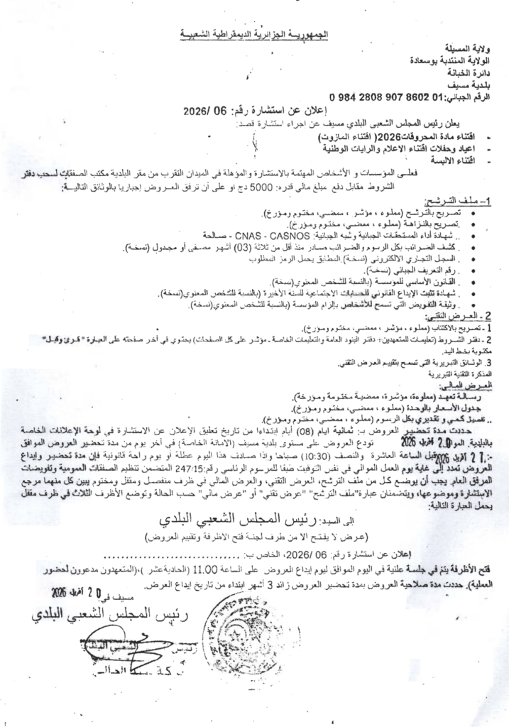 إعلان عن استشارة 2026/06 بلدية مسيف