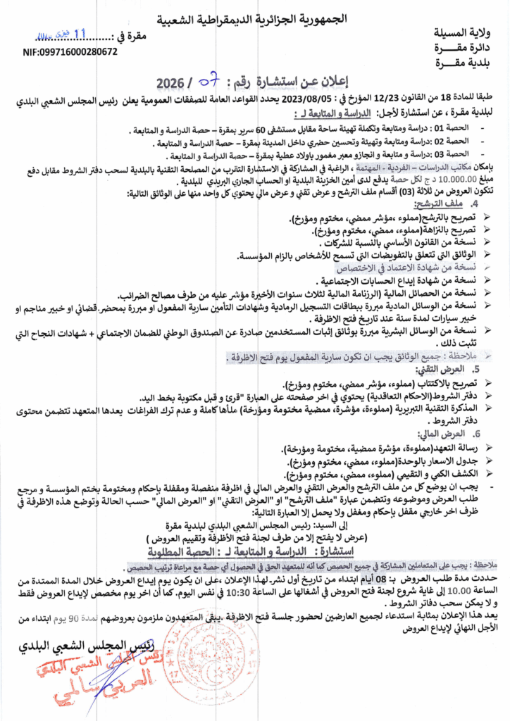 إعلان عن استشارة 2026/07 بلدية مقرة