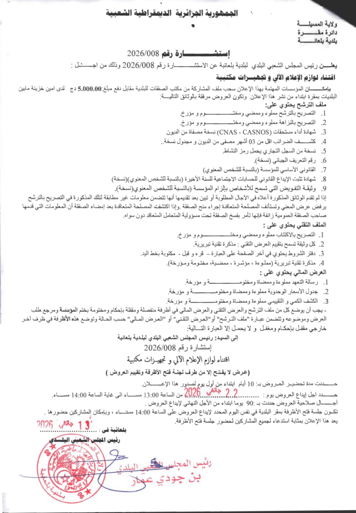 إعلان عن استشارة 2026/08 بلدية بعايبة