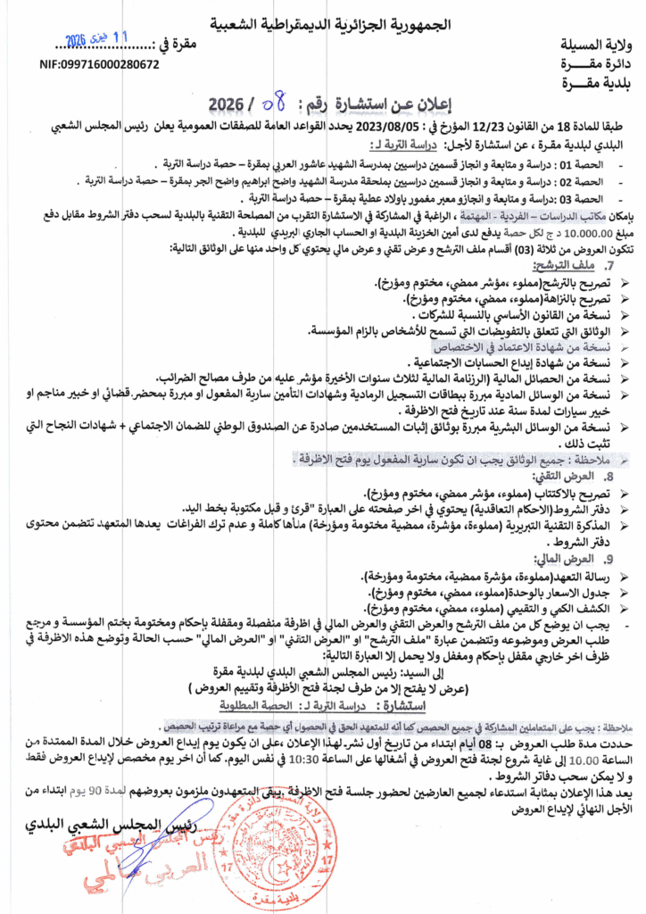 إعلان عن استشارة 2026/08 بلدية مقرة