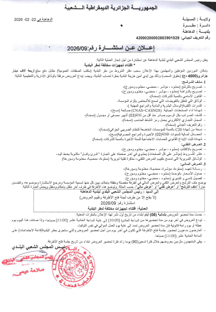 إعلان عن استشارة 2026/09 بلدية الدهاهنة