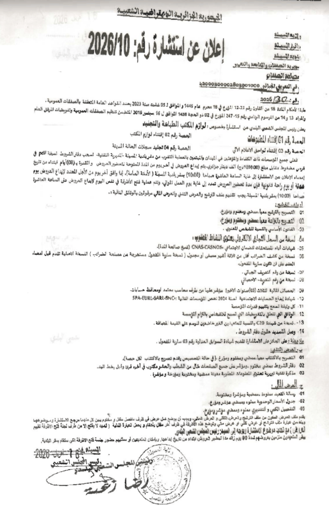 إعلان عن استشارة 2026/10 بلدية المسيلة