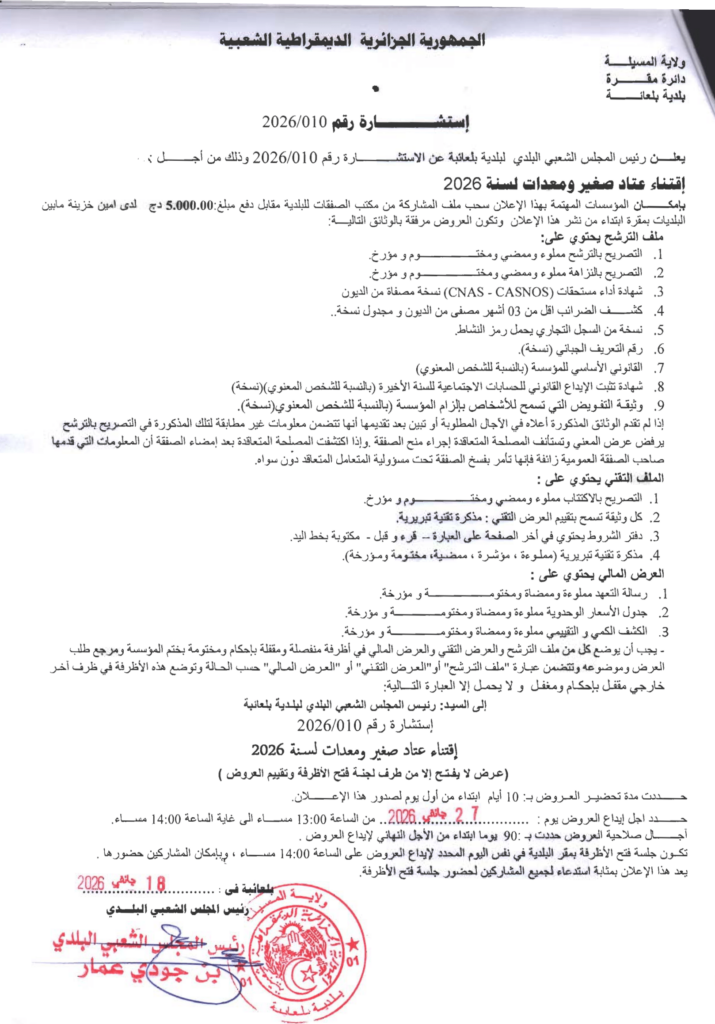 إعلان عن استشارة 2026/10 بلدية بلعايبة