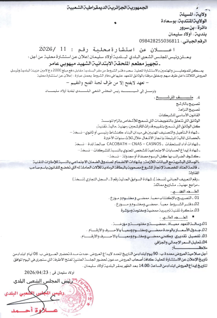 إعلان عن استشارة 2026/11 بلدية أولاد سليمان