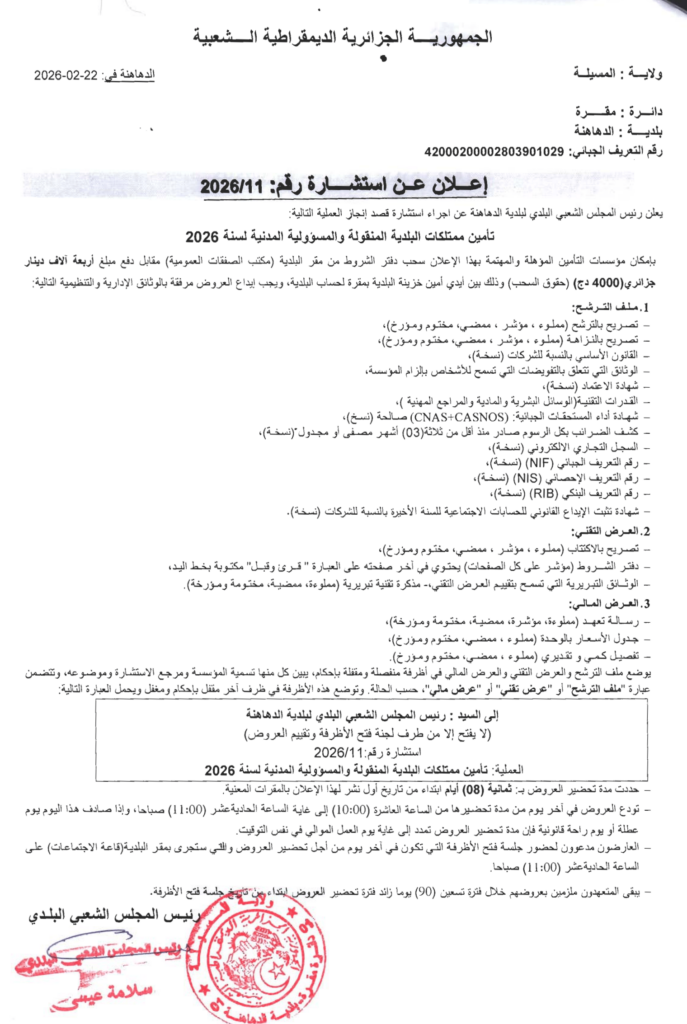 إعلان عن استشارة 2026/11 بلدية الدهاهنة