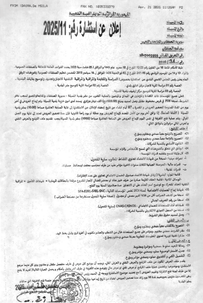 إعلان عن استشارة 2026/11 بلدية المسيلة