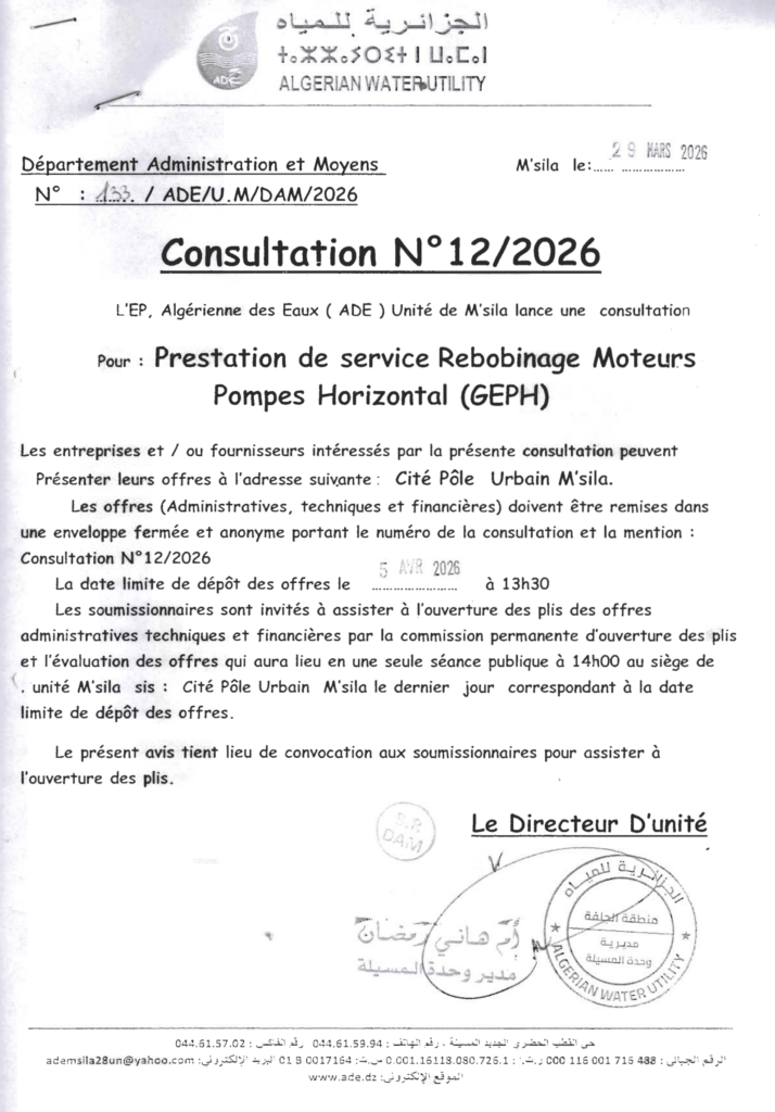 إعلان عن استشارة 2026/12 الجزائرية للمياه وحدة المسيلة