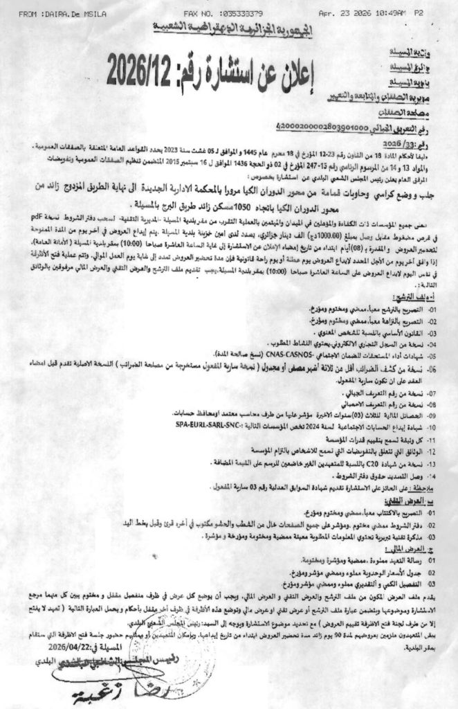 إعلان عن استشارة 2026/12 بلدية المسيلة