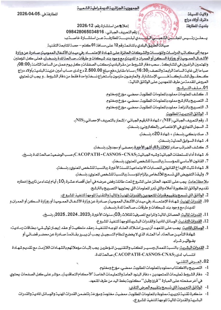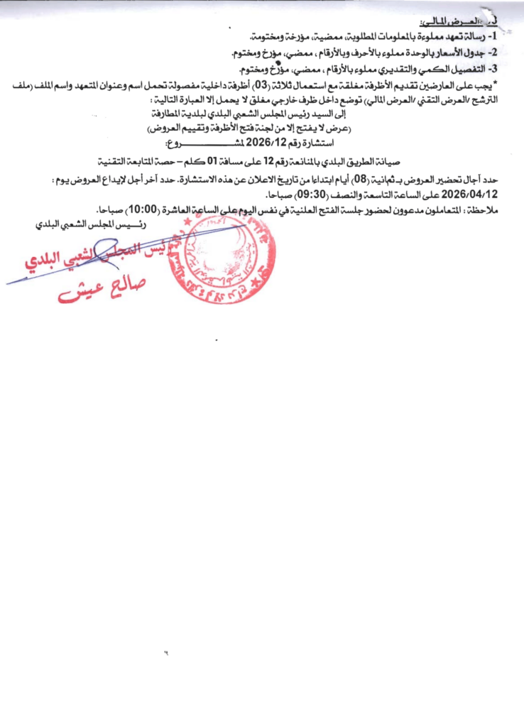 إعلان عن استشارة 2026/12 بلدية المطارفة