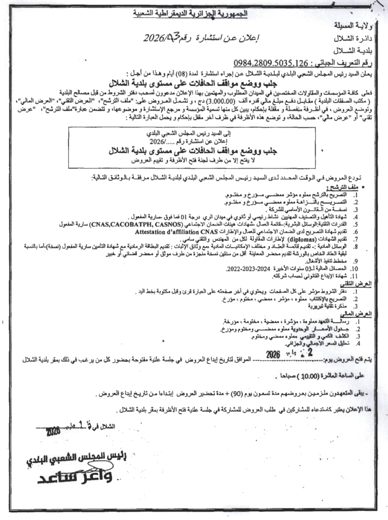 إعلان عن استشارة 2026/13 بلدية الشلال