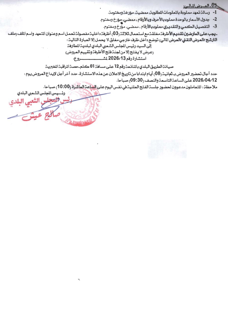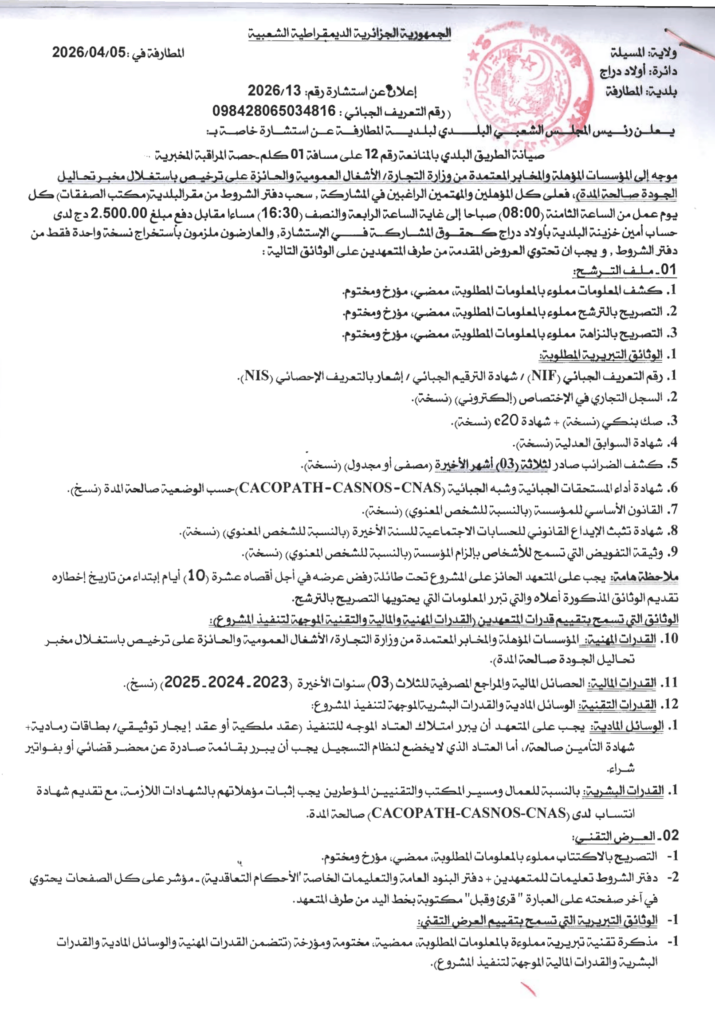 إعلان عن استشارة 2026/13 بلدية المطارفة