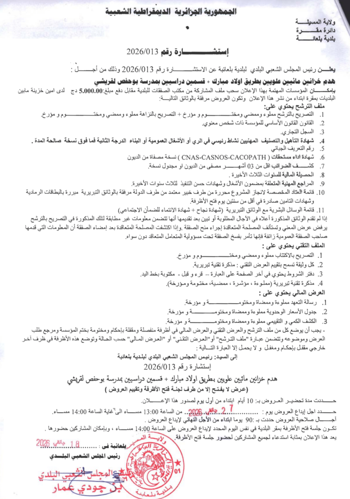 إعلان عن استشارة 2026/13 بلدية بلعايبة