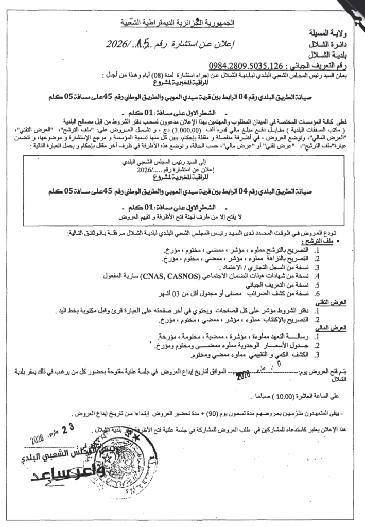 إعلان عن استشارة 2026/15 بلدية الشلال
