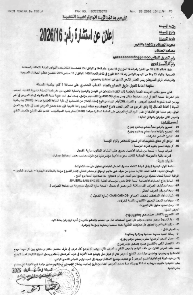 إعلان عن استشارة 2026/16 بلدية المسيلة