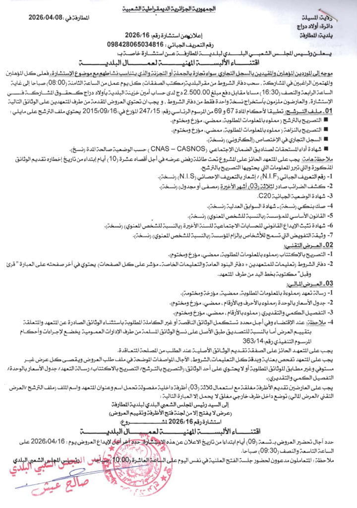 إعلان عن استشارة 2026/16 بلدية المطارفة