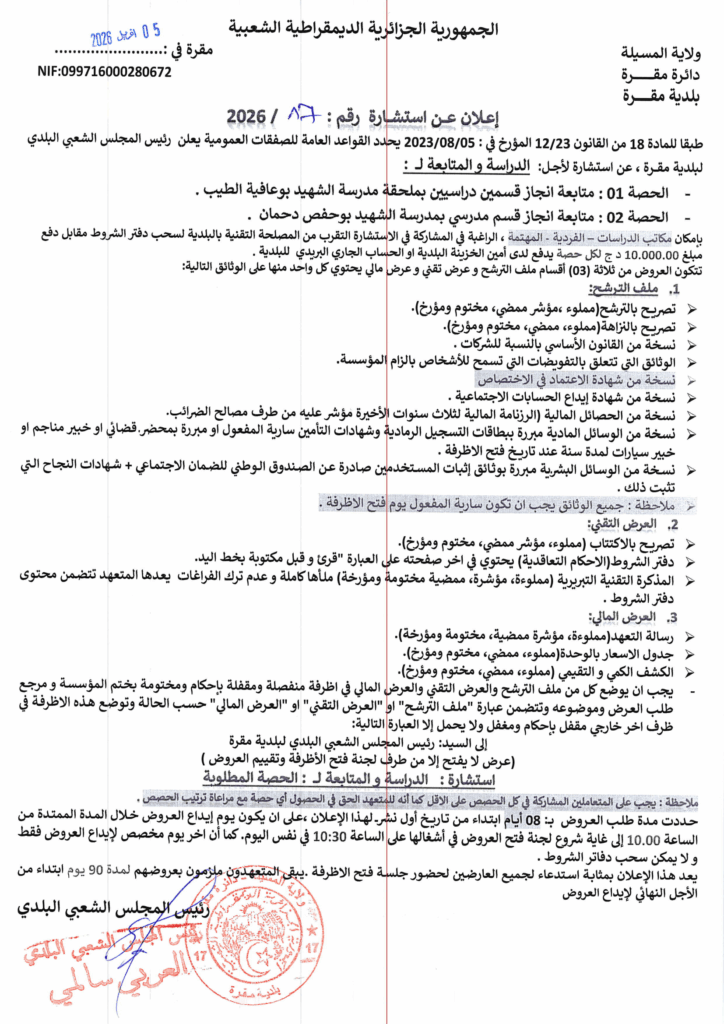 إعلان عن استشارة 2026/17 بلدية مقرة