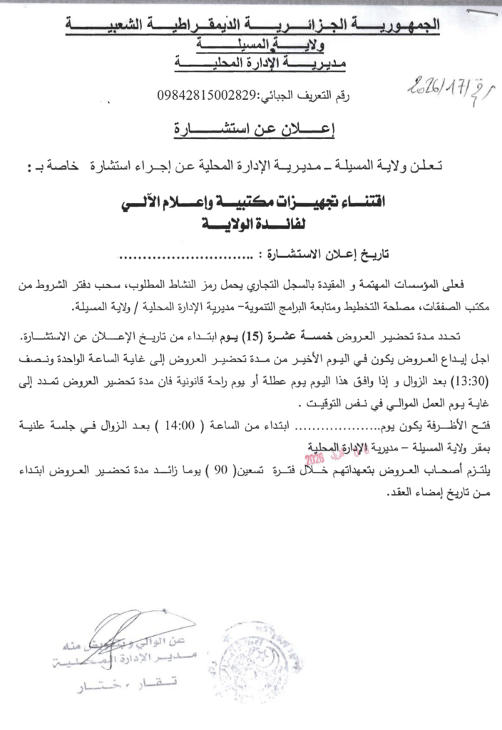 إعلان عن استشارة 2026/17 مديرية الادارة المحلية لولاية المسيلة