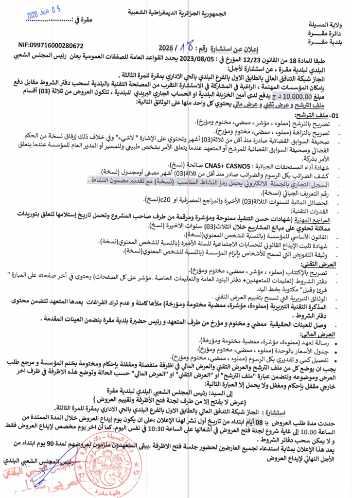 إعلان عن استشارة 2026/18 بلدية مقرة