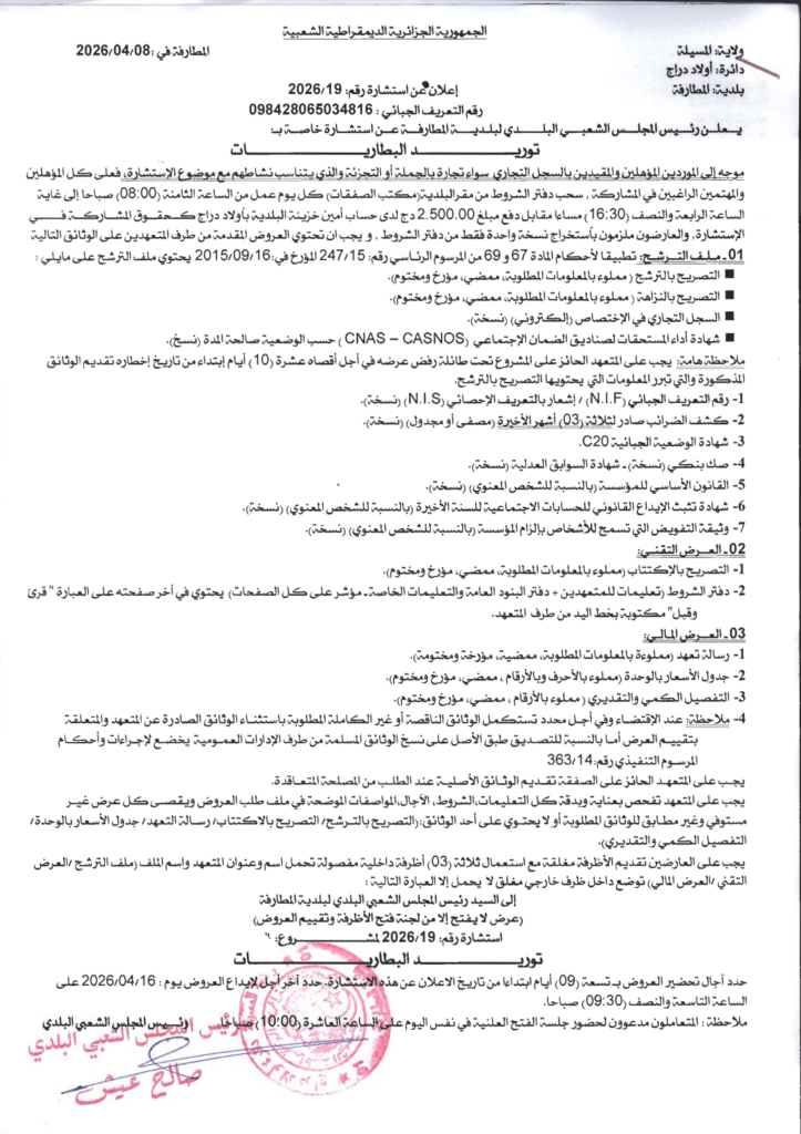 إعلان عن استشارة 2026/19 بلدية المطارفة