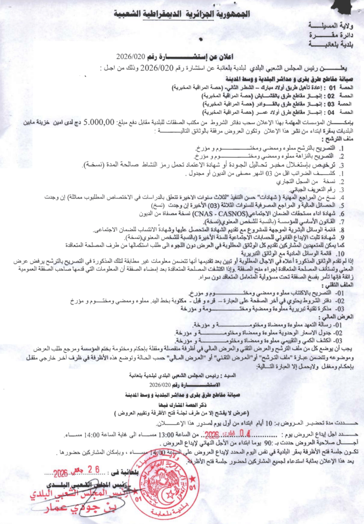 إعلان عن استشارة 2026/20 بلدية بلعايبة