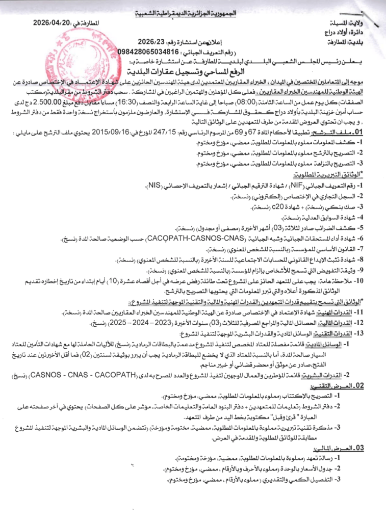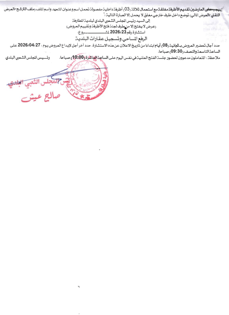 إعلان عن استشارة 2026/23 بلدية المطارفة
