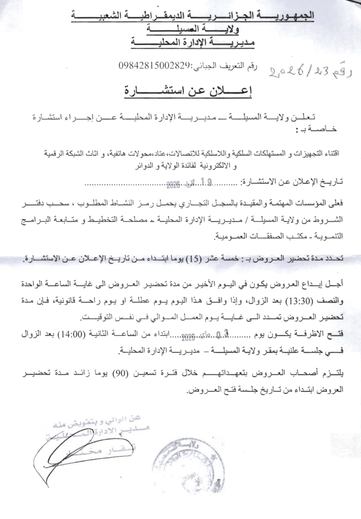 إعلان عن استشارة 2026/23 مديرية الإدارة المحلية لولاية المسيلة