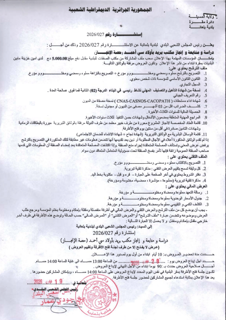إعلان عن استشارة 2026/27 بلدية بلعايبة