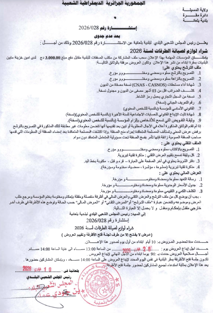 إعلان عن استشارة 2026/28 بعد عدم جدوى/ بلدية بلعايبة