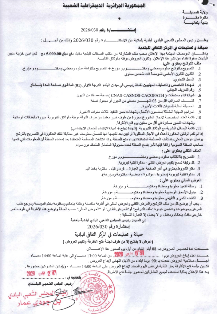إعلان عن استشارة 2026/30 بلدية بلعايبة