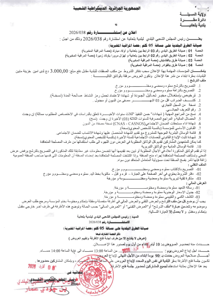 إعلان عن استشارة 2026/38 بلدية بلعايبة